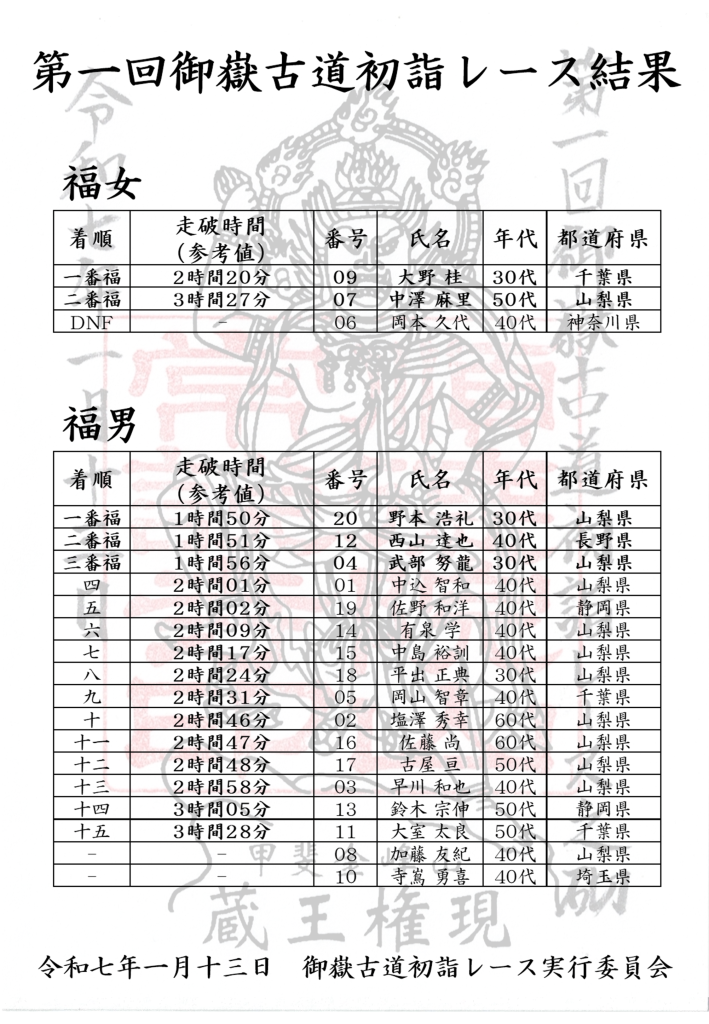 御嶽古道初詣レースにご参加いただいた皆様、誠にありがとうございました。ここでは、これまでの大会結果を掲載しています。